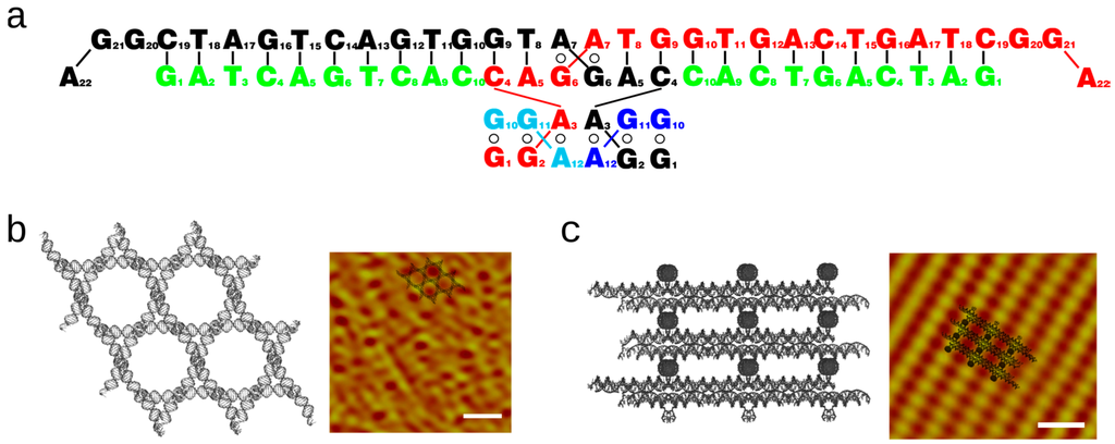 The expanded non-canonical lattice. (a) Secondary structure of the expanded lattice. Green “spacer” strands are required to pair with the 10 or 11 nucleotide expansion; (b,c) Models of the expanded solvent channels parallel and perpendicular to the six-fold symmetry axis, respectively. AFM images confirmed the presence of the solvent channels and unit cell dimensions, along with low resolution diffraction [65]. Scale bars are 20 nm.
