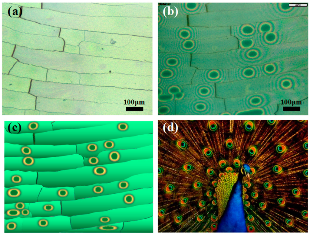 Optical microscope images of as-prepared sample. (a) Front side of the sample; (b) Back side of the sample; (c) Scheme for the as formed sample; (d) Eyes pattern of peacock tail feather (The picture was obtained from [25]). The front side of the sample shows crossed crack, while the back side of the sample shows plenty of the eyes pattern similar to the peacock tail feathers.