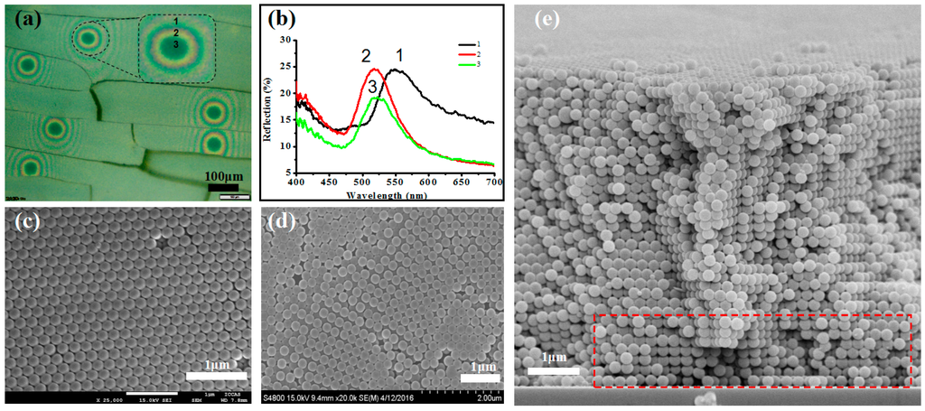 (a) Optical microscope image of the assembly sample with eye pattern; (b) UV-vis spectra of different parts of the peacock eye pattern structure; (c,d) SEM images of assembled photonic crystals (PCs) with close-packed arrangement (c) and non-closed packed region (d); (e) Cross section SEM image of sample in red rectangle part indicates the transverse of yellow and green connection part of the eye pattern.
