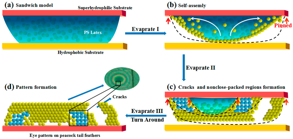 To clearly understand the formation process of PCs with eye pattern similar to the peacock tail feather, Scheme 1 puts forward a possible formation mechanism for the whole assembly process. At first, the Poly(St-MMA-AA) latex was sandwiched between the pre-treated hydrophobic and the superhydrophilic one. The latex suspension will spread fully onto the superhydrophilic substrate, keeping away from the hydrophobic one. During the evaporation process, TCL pins at the superhydrophilic substrate [27], but keeps continuously receding at the hydrophobic one. As TCL is pinned at the superhydrophilic substrate, hexagonal close-packed structures are obtained. However, as TCL receding continues with increased evaporation time, non-close-packed assembly structure can be formed [28] by the trace of the receding path. The change of the assembly structure from close-packed to non-close packed resulted in a red-shift of the optic signal as shown in Figure 2b. Generally, three assembly steps occur in the whole process based on distinct assembly concentration and evaporation time as shown in Scheme 1. The first assembly step takes place when TCL of the latex pins at the superhydrophilic substrate with the solvent evaporation, implying an initial assembly of latex particles at the interface of gas-liquid and solid-liquid in Scheme 1b. In this process, the close-packed assembly can be observed at the interface of the solid-liquid accompanied with the outward reflux of the latex owing to the fastest evaporation rate at the brim region. In the second assembly step, pinned TCL will recede owing to the increased assembly concentration accompanied with the evaporation time. Simultaneously, the non-close-packed assembly is observed at the solid-interface as shown in Scheme 1c resulting from the receding process of TCL [28,29], corresponding to the red-shift at Figure 2b. The transformation from close packed to non-closed packed structure can be proved from cross-section SEM images in the red rectangle shown in Figure 2e. In the third assembly, TCL of the latex pinned again at the superhydrophilic substrate means that it was close-packed assembly again. However, owing to the outward transfer of the latex at the assembly I, less latex is left at the core part, resulting in a decreased periodic number of close-packed structure and blue-shift spectra signal than the bulk PC, which is consistent with the grass-green core of the eye-pattern. The presumption that less latex remained at the core part can be confirmed from the low adhesive property on core-part and high adhesion property on the brim part as shown in Figures S3 and S4. As a result, all of these contribute to the formation of an eye pattern similar to that of a peacock tail feather on the superhydrophilic substrate.