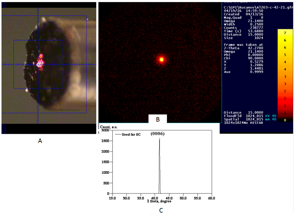 Determination of the seed orientation by means of the XRD techniques: (a) Positioning on X-ray beam on samples area by means laser-video system; (b) scan frame; (c) XRD pattern.