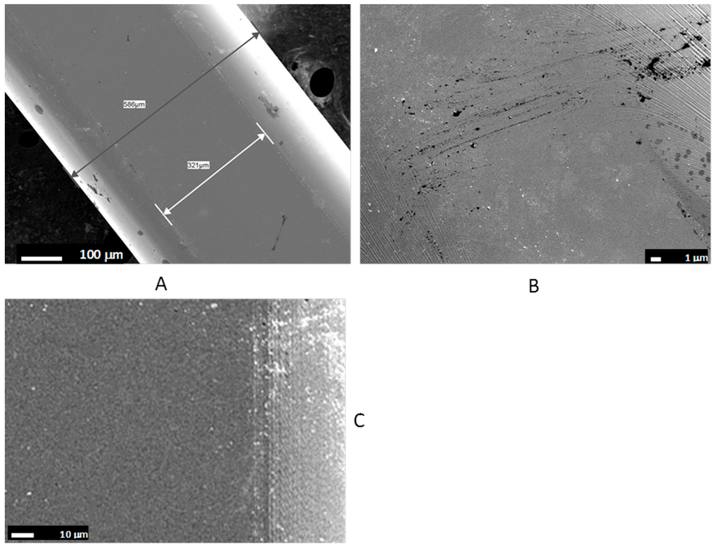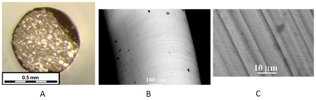 Optical (A) and SEM photographs (B,C) of an SC sapphire fiber grown up along axis [0001] at the precise seed orientation. Photographs demonstrate a slightly rounded-off cross-section (A); the absence of large facets, but the presence of micro-facets on the lateral surface (B); and the period of the small-scale faceting of the lateral surface (C).