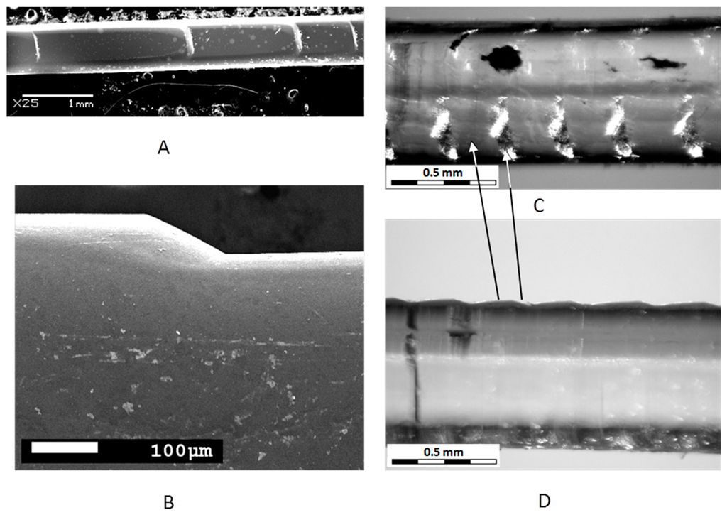 In the presence of power fluctuations of the heating laser (temperature fluctuations in the melt zone), the facets on the fiber lateral surface were rough (Figure 7D, an SC fiber with a diameter of 615 μm) and strongly varied in length. The defects visible in the photographs show that the growth process was unstable. The growth steps can be easily seen on the surface of the rounded part.