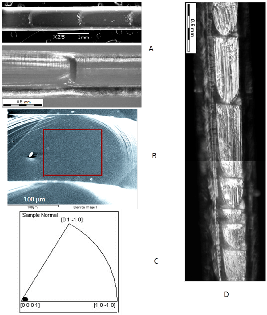 Optical microphotograph (A bottom, D) and SEM image (B) of a sapphire SC fiber grown along axis [110]: (A) general view of flat faces; (B) SEM image of one of the flat planes, with the region of the EBSD-measurement pointed out by a rectangle; (C) polar figure after JSM-5910LV (JEOL) software; (D) general view of the defected faces (combination of several photos along the sapphire fiber).