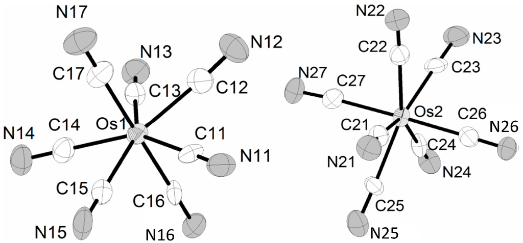 The number of osmium homoleptic complex cyanides is limited to the hexacoordinated coordination compounds of two metal oxidation states—two and three. If the hexacyanoosmate(II) was known for a long time [], its crystal structure having been determined for the sodium salt Na4[OsII(CN)6]·10H2O [], the paramagnetic hexacyanoosmate(III) was only recently structurally characterized and magnetically investigated as Ph4P+ salt [] despite the successful synthesis of n-Bu4N analog almost 50 years ago []. Both paramagnetic cyanides were prepared starting from the diamagnetic precursor K4[OsII(CN)6]·3H2O.