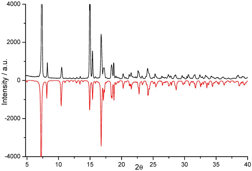 Calculated from the single-crystal diffraction data (red) and experimental powder XRD (black) diffractograms for 1.