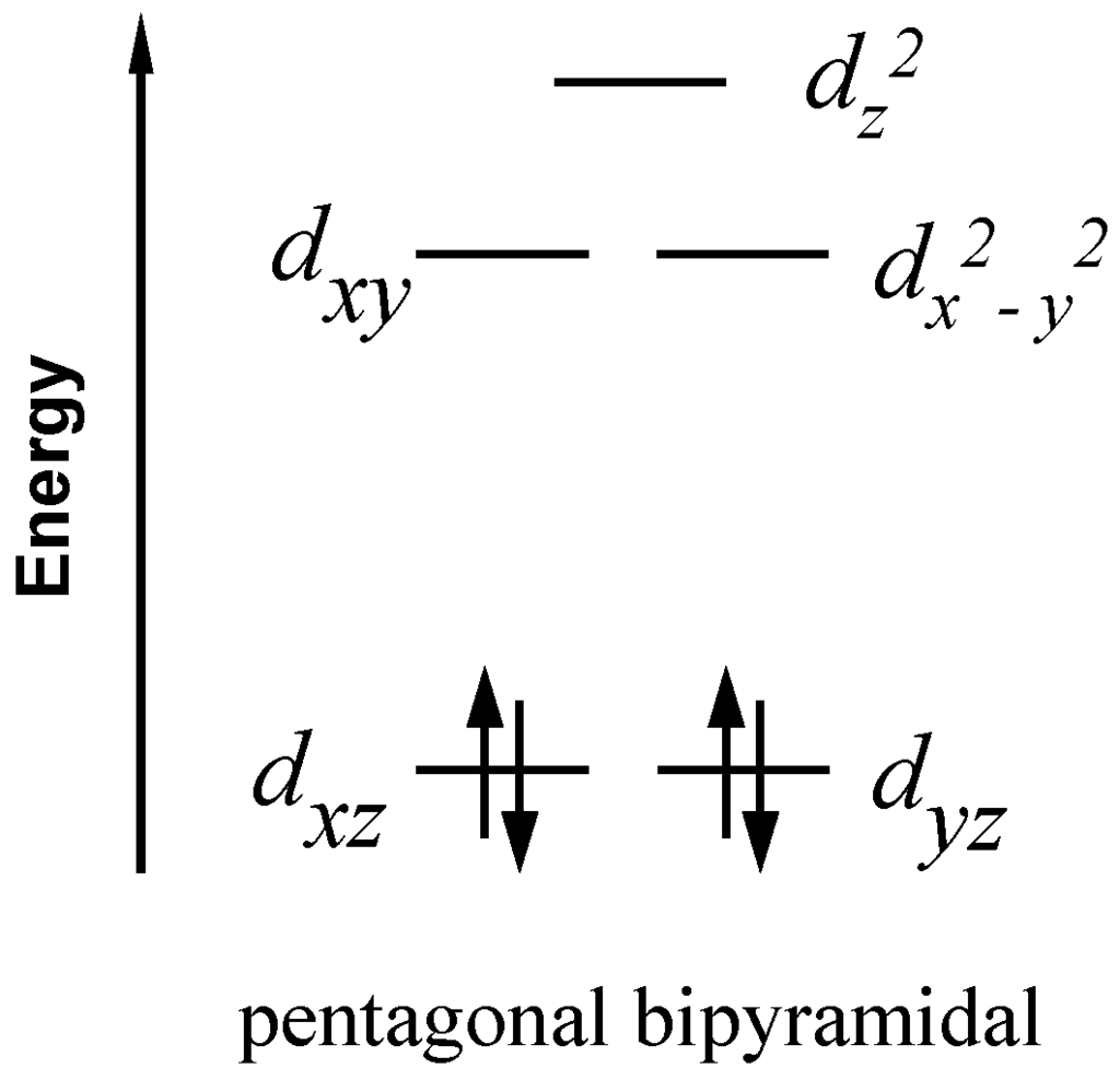 The qualitative d-orbital energy-splitting diagram for pentagonal bipyramidal geometry and the ground-state electronic configuration of 1.