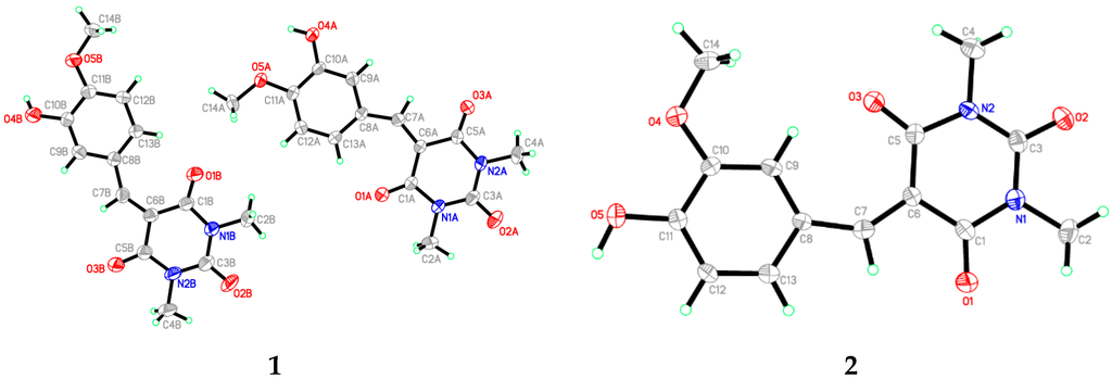 The 3D chemical structure of the 5-(3-Hydroxy-4-methoxybenzylidene)-1,3-dimethylpyrimidine-2,4,6(1H,3H,5H)-trione; 1 has a prymidine-trione ring (C1/N1/C3/N2/C5/C6) and a benzene ring (C8/C9/C10/C11/C12/C13) which are bound together through the exo-double bond C6-C7. The unit cell contains two independent molecules. The dihedral angles between the two rings are 1.38 (3)° and 5.58 (2)° in molecule A and B, respectively. Thus the molecules are nearly planar. Similarly, the 3D chemical structure of the 5-(4-Hydroxy-3-methoxybenzylidene)-1,3-dimethylpyrimidine-2,4,6(1H,3H,5H)-trione 2 was solved. The unit cell contains only one independent molecule and the dihedral angle between the two rings is 2.43 (3)°.