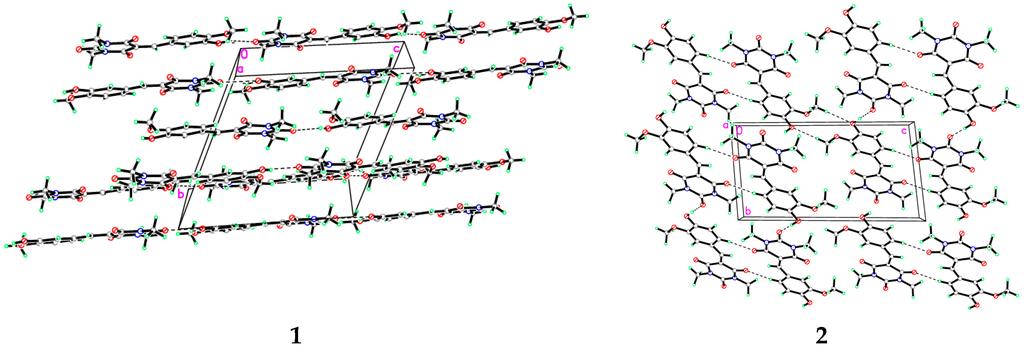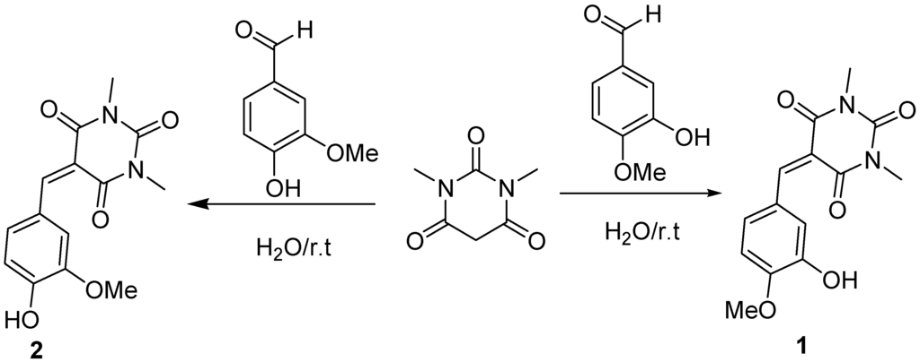 The arylidene-1,3-dimethylpyrimidine-2,4,6(1H,3H,5H)-trione derivatives 1 and 2 were synthesized as shown in Scheme 1. Barbituric acid derivatives, and 3-hydroxy-4-methoxybenzaldehyde (for the synthesis of 1) or 4-hydroxy-3-methoxybenzaldehyde (for the synthesis of 2) are commercially available. The reaction proceeds smoothly with the mixingof equimolar amounts of the substituted aldehyde and barbituric acid derivative in water at room temperature providing the arylidene compounds in excellent yield. The molecular structures of the later products were investigated by using different spectroscopic techniques such as1H, 13C-NMR, IR, GCMS, and the X-ray single crystal technique.