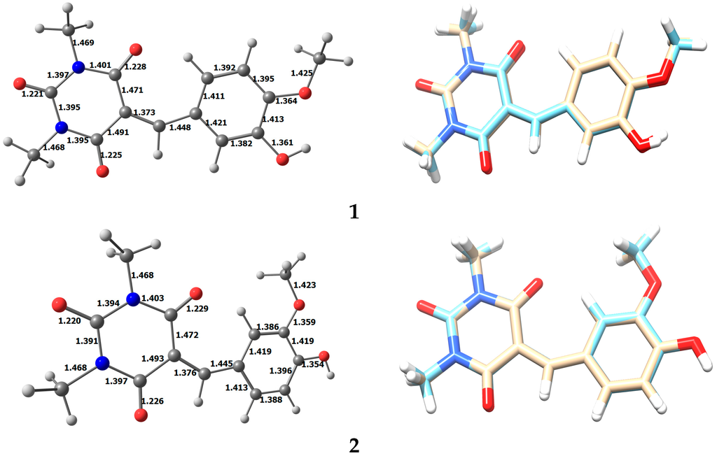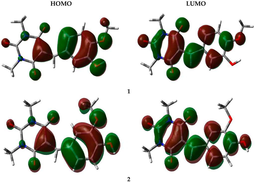 The optimized structures of the two isomers 1 and 2 are given in Figure 3. Overlay between the optimized and experimental structures are also shown in the same Figure. Tables S1 and S2 (Supplementary Materials) showed the complete list of bond distances and bond angles obtained from the Density functional theory (DFT) calculations and compared with the X-ray results. The results indicated good agreement between the calculated and experimental structures. The correlation coefficients between the calculated and experimental geometrical parameters are 0.988–0.993 and 0.985–0.987 for bond distances and angles, respectively. The maximum bond distance deviations are 0.027 Å (1.95%) and 0.024 Å (1.76%) for compounds 1 and 2, respectively. Similarly, the bond angles are predicted very well, the maximum percentage errors are 1.86% (2.194°) for 1 and 1.97% (2.312°) for 2. The small differences between the calculated and experimental geometries are mainly attributed to the known fact that the experimental solid state structure includes intermolecular forces that significantly affect the geometric parameters while the calculated one is a single molecule in the gas phase. It is worth noting that1is characterized by an intramolecular O–H–O(CH3) interaction between the OH group and the neighboring oxygen of the methoxy group where the H–O distance is calculated to be 2.097 Å while the donor-acceptor (O–O) distance is predicted to be 2.650 Å (exp. 2.690Å). Such H–O interaction was not observed in 2.
