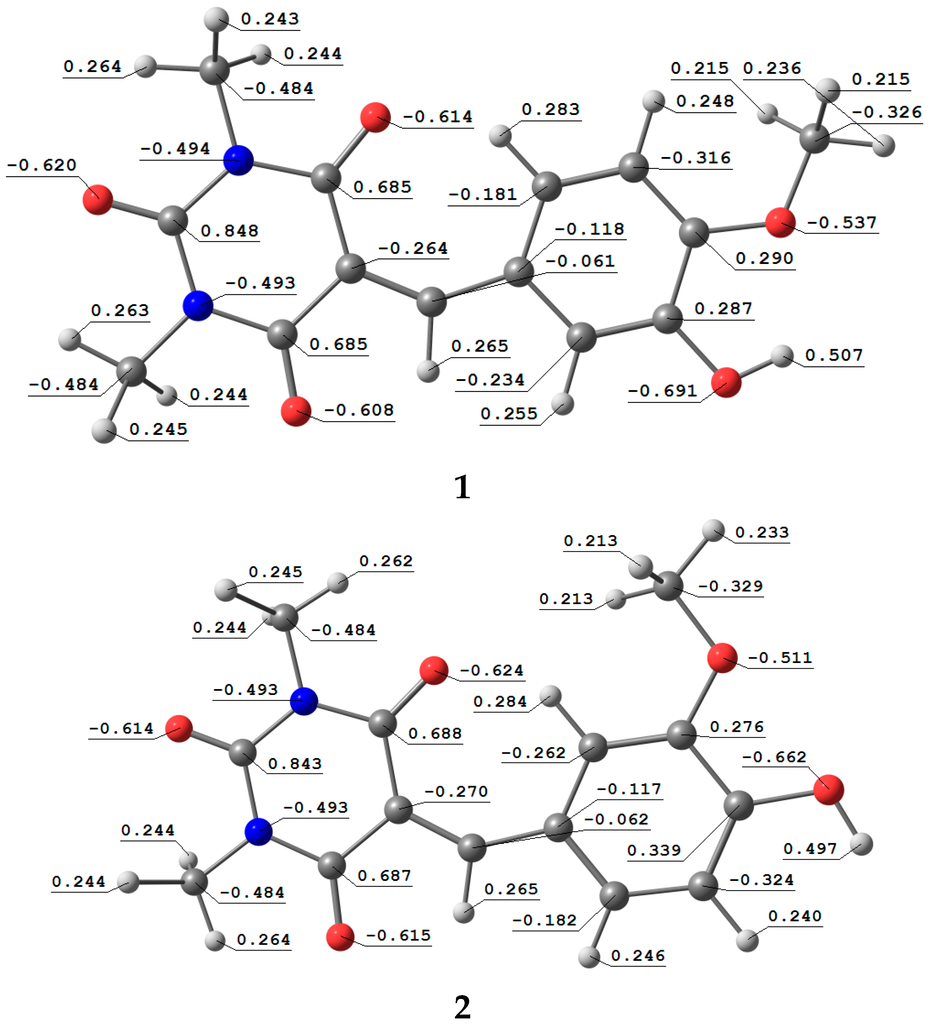 Figure 5 exhibits the calculated natural atomic charges (QN) for all atomic sites. The O and N-atoms have the highest electronegativity and so are expected to have the highest natural charge values. Hence these sites are the most favored to interact with the positively charged receptor active site. In contrast, the OH proton is the most electropositive and is the most favored site to be attached by the negative part of the receptor active sites. The aliphatic carbon atoms are predicted to be more electronegative than the aromatic ones. The ring C-atoms attached to either O or N atoms showed high electropositive character. The most electropositive carbon is the one lying between two N atoms and one O atom. The formation of H-bonding interaction usually affects the charges at the hydrogen, donor and acceptor atoms. It is of note that the charge at the OH proton of 1 is higher than that in 2. In contrast, its oxygen atom (H-donor) is more electronegative in the former compared to the latter. The acceptor O-atom (OCH3) in 1 has more negative charge in 1 than 2.The electrostatic potential (ESP) map shown in Figure 6 indicates that the most reactive electrophilic (blue) and nucleophilic (red) sites are the OH proton and O-atoms in both compounds.