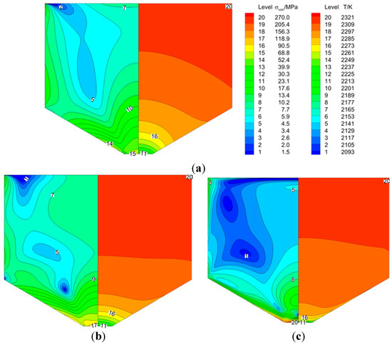 Internal radiation in semitransparent oxide crystal depends largely on the absorption coefficient. In this section, numerical calculations were carried out for a wide range of absorption coefficient to examine its effect on heat transfer and thermal stress in the crystal. Figure 5 shows the temperature and thermal stress distributions in the crystal with different absorption coefficients. For the case of a = 0 m−1, the crystal is totally transparent and radiation heat just passes through the crystal without directly coupling into the temperature field. The isotherms present a similar convex shape as the crystal without internal radiation, with a much smaller temperature difference due to the strongly enhanced heat transfer ability. As the absorption coefficient increases, the isotherms are gradually concentrated in the bottom region of the crystal under the interaction between internal radiation and heat conduction. Besides, the isotherms gradually change into a convex–concave shape at the conical region of the crystal. As the absorption coefficient further increases, internal radiation heat transfer becomes weak and heat conduction gradually governs heat transport through the crystal. The concentration of isotherms in the bottom region is gradually released and the concave shape along the conical edge is gradually disappeared. The isotherms become similar to those of the crystal without internal radiation again. As the absorption coefficient increases, the thermal stress in the central region of the crystal first decreases and then increases.