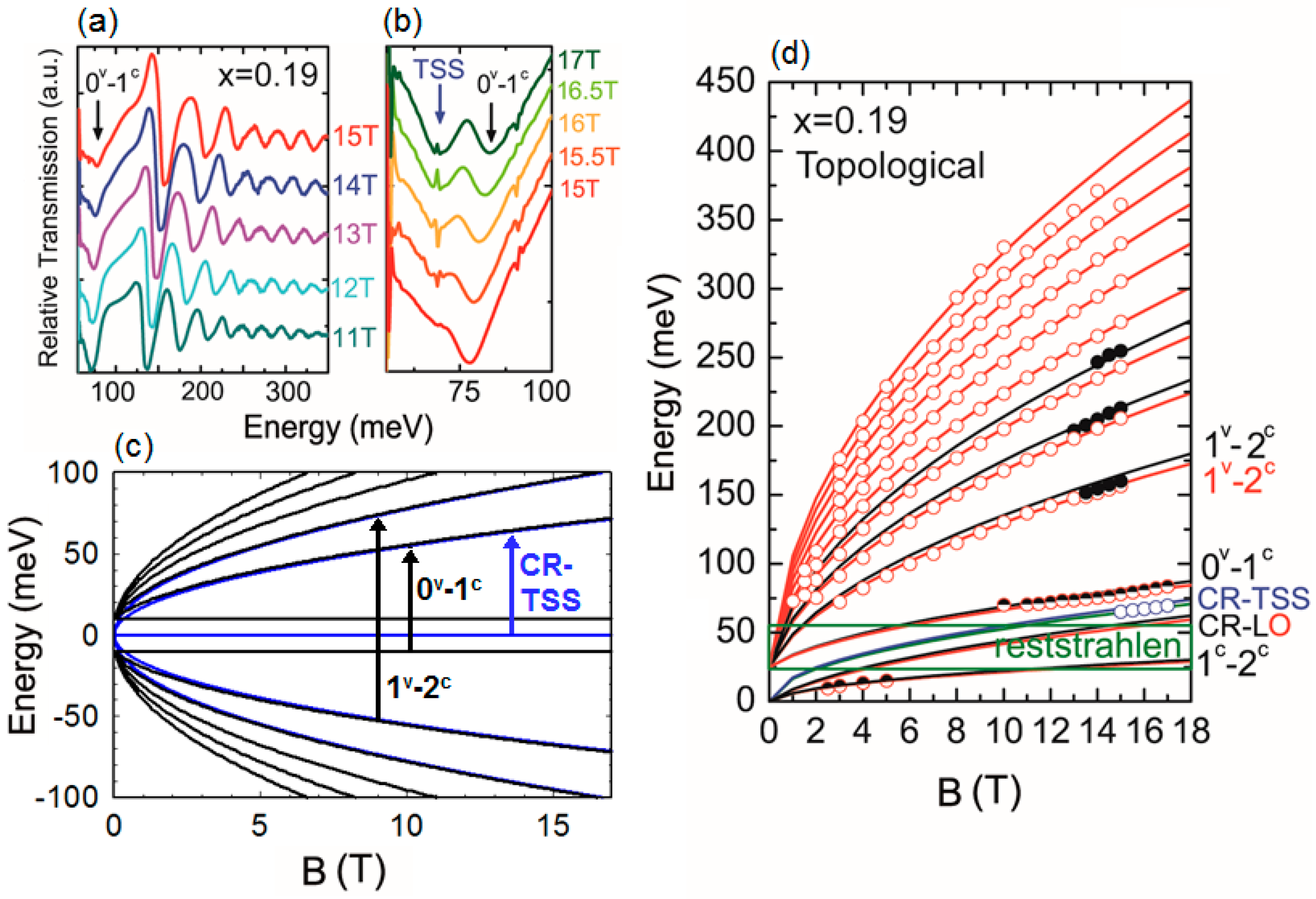 Figure 4a,b, respectively, show the relative transmission amplitude from transitions observed between 11T and 15T in the MIR range and between 15 T and 17 T for the FIR range. We know a priori from transport measurements that this sample is slightly p-type having a Fermi level intersecting the bulk valence band. In