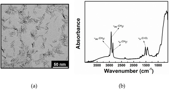 (a) Transmission electron microscopy image of a typical TiO2 NR sample. (b) FT-IR-ATR spectra of TiO2 NRs in the 4000–600 cm−1 region after the purification step.
