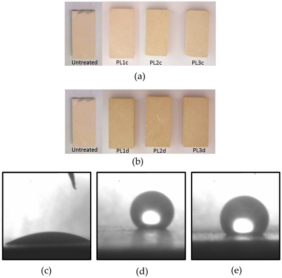 The visual appearance of the PL sample, after the treatment, either by casting and dipping did not show any significant colour variation in comparison with an untreated sample, as reported in Figure 2a,b.