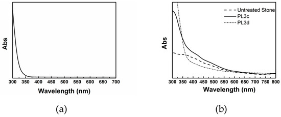 (a) Absorption spectrum of a chloroform solution of TiO2 NRs; and (b) reflectance spectrum of a Pietra Leccese sample PL3c and PL3d before and after TiO2 NR deposition.