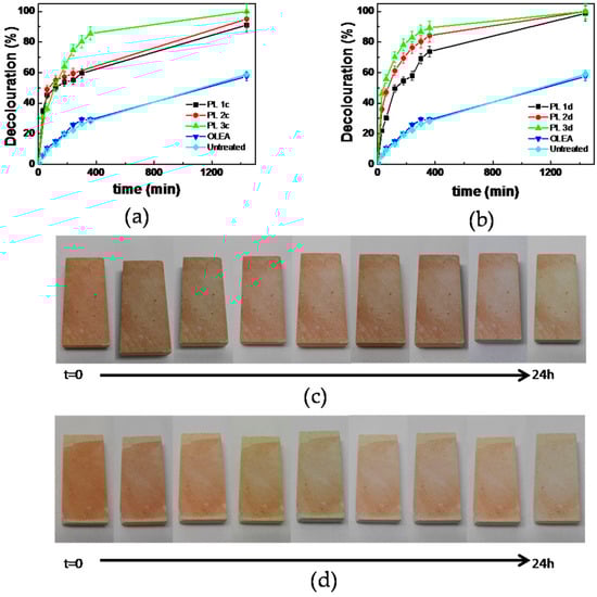 Photocatalytic decolouration of Methyl Red (MR) calculated for all PL samples treated by: casting (a); and dipping (b) exposed to a solar light simulator for 24 h. An untreated PL sample and a PL sample with OLEA were considered as a reference. Reported data are presented as mean values ± standard deviation obtained from the analysis of two replicates. Visual appearance of samples: PL3c (c); and PL3d (d) during the photocatalysis experiments. The pictures highlight the effective degradation of MR applied on the treated surface, as indicated by the progressive decolouration of the surface of the stone sample.