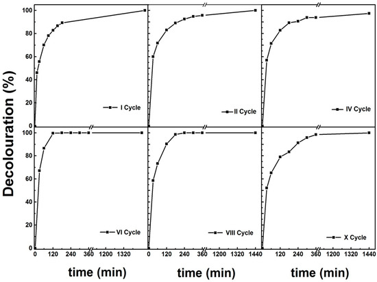 The percentage of decolouration was calculated through the value of absorbance measured at 460 nm at subsequent times, by the following Equation: