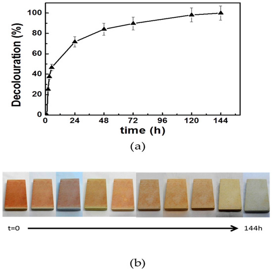 (a) Trend of MR decolouration assisted by the sample PL3d in the course of outdoor experiments carried out for one week outdoors. In this period, the humidity was measured in the range of 57%–88% and the weather was partially cloudy. Reported data are presented as mean values ± standard deviation obtained from the analysis of two replicates. (b) Pictures of untreated PL3d sample in the time course of outdoor photocatalytic degradation experiment, which point out the progressive decolouration of its surface.