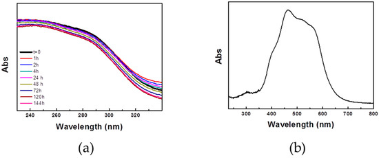 Absorbance spectrum of the sample PL3d (calculated from reflectance measurements) in the course of photocatalysis experiment outdoor. (a) Reflectance spectrum in the range of 230–350 nm where the signal of TiO2 NRs is typically detected. The spectrum shows how the TiO2 NR signal did not undergo significative variations in the course of experiment, thus suggesting the stability upon outdoor exposition. (b) Absorbance spectrum of the PL3d specimen stained with the Methyl Red, acquired using the PL3d sample as reference. The reflectance spectrum highlights that MR does not absorb below 350 nm.