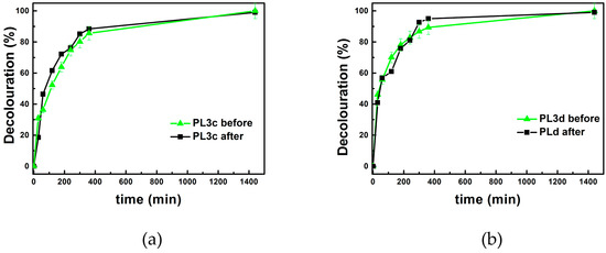 Photocatalytic tests were typically carried out for 24 h, following the temporal evolution of the main MR absorption peak at 460 nm. The decolouration percentage over the irradiation period was calculated as reported in Section 3 for all investigated coatings. It is reported as function of irradiation time in Figure 4a,b for the PL samples treated by casting and dipping, respectively.