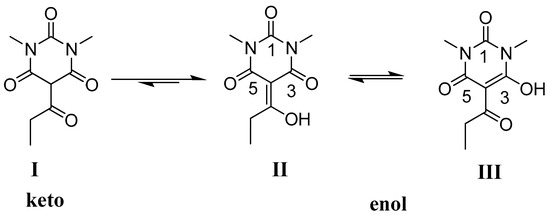 1,3-Dimethyl-5-propionylpyrimidine-2,4,6(1H,3H,5H)-trione was prepared by reaction of 1,3-dimethylpyrimidine-1,3,5-trione with propionic anhydride in the presence of NaHCO3 to afford the target product in yield 81%. Recently, DaSilva et al. [19] and Giziroglu et al. [20] reported that the acetyl derivative (R = CH3) exist in three tautomeric structures, as indicated in Figure 1. To select the right tautomer for the title compound, 1H NMR in CDCl3, DMSO-d6 and acetone-d6 was checked. The 1H NMR in CDCl3 (Figure S2, Supplementary Materials) showed triplet peak at δ = 1.21 and 3.16 related to the ethyl group, two singlet peaks at δ = 3.32 and 3.36 corresponding, the two N-CH3 and a singlet peak at 17.61 for the enolic OH. 13C NMR (Figure S3, Supplementary Materials) showed peaks at δ = 9.4 and 27.9 for the ethyl group and one peak at δ = 30.4 for the two N-CH3, the peak at δ = 94.9 for the C=C-OH, while the other peaks are related to the three carbonyl groups at δ = 150.4 (C1), 160.8 (C5), 169.9 (C2H5-CO), and at δ = 200.6 (C=C-OH, enolic carbon). This observation is in a good agreement with structure III (Figure 1).