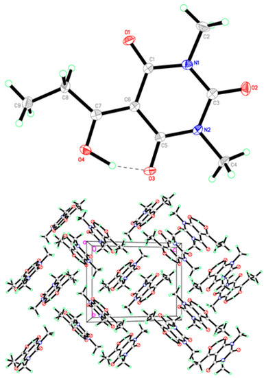 Then, we checked the 1H NMR in DMSO-d6 (Figure S5, Supplementary Materials), and observed that the spectral data were slightly different compared to in CDCl3, where the 1H NMR showed triplet peak at δ = 1.14 and quartet peak at δ = 3.12 related CH3-CH2, one singlet peak at δ = 3.18 for the two N-CH3 and a singlet peak at δ 17.62 for the enolic OH. The 13C NMR (Figure S6, Supplementary Materials) showed peaks at δ = 9.8 and 28.1 for the ethyl group (CH3-CH2) and one peak at δ 30.1 for the two methyl (N-CH3), the peak at δ = 95.4 for the C=C-OH, one peak at δ = 150.5 for C1 (C-CO-C), one peak at δ = 161.1 for the carbon (C3 and C5), and finally one peak at δ = 199.4 related to the enolic carbon (C=C-OH). This observation is also in good agreement with the proposed structure II. The 1H NMR in acetone (Figure S4, Supplementary Materials) showed the same observation as in case of DMSO. To check the effect of temperature on the stability of the proposed structure, 1H NMR in DMSO at 20 °C, 30 °C and 40 °C (Figures S5, S7 and S8, Supplementary Materials) was also observed. The spectral data did not change except that the peaks at 17.6 became broader. This mean that the enol form is stabilized by strong H-bond, and the obtained results agreed with the reported data for the aroylhydrazone derivatives of 1,3-dimethyl-5-acetylbarbituric acid reported by DaSilva and others [19,20]. Finally, the NMR data obtained explain that this type of compound exists in solution in the enol form and the structure of the enol depends on the type and polarity of the solvent use as it is stabilized by presence of strong intra-molecular hydrogen bond which was further confirmed by X-ray spectroscopy.