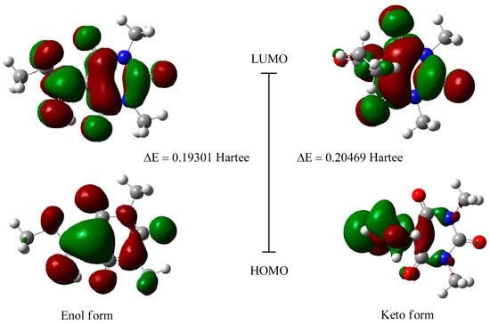 The geometry of the title compound was optimized using DFT method in the gas phase. The crystal structure of title compound (enol form) was used for DFT studies. The energy gap between HOMO and LUMO was calculated by B3LYP method using 6-311G++(d,p) basis set. The title compound (in enol form) shows energy gap (ΔE = 0.19464 Hartree = 5.25 eV) for HOMO → LUMO (Figure 3). The keto form was optimized using GaussView05 [26] and the results were compared with that of enol form, as shown in Table 2. The keto form shows energy gap (ΔE = 0.20469 Hartree = 5.57 eV) for HOMO → LUMO), which is higher than that of enol form.