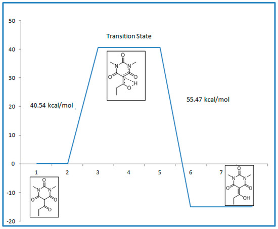 A transition state is a first order saddle point on the Potential Energy Surface (PES) of the molecular system. The vibrational spectrum of a transition state is characterized by one imaginary frequency (implying a negative force constant), which means that in one direction in nuclear configuration space the energy has a maximum, while in all other orthogonal directions the energy is a minimum [33]. To verify this, keto form of the title compound was optimized using Gaussian09. The optimized geometry was used to perform frequency calculations at the same computational level (Table S3, Supplementary Materials). Molecules have enough thermal and kinetic energy at room temperature to allow processes requiring between 15 and 20 kcal/mol [34]. The calculated energies are tabulated in Table 3 and shown schematically in Figure 4. The calculated energy confirms that the reaction (Figure 1) is more favorable in enol form. To convert the keto form to the enol, an energy barrier of 55.47 kcal/mol needs to be overcome (Table S4, Supplementary Materials); this is much higher than the inherent energy of 15–20 kcal/mol limit at room temperature [35,36]. Hence, the theoretical results suggest that if the product (enol) is formed, it will not interconvert at room temperature. This is confirmed by the NMR spectra (only enol form is observed).