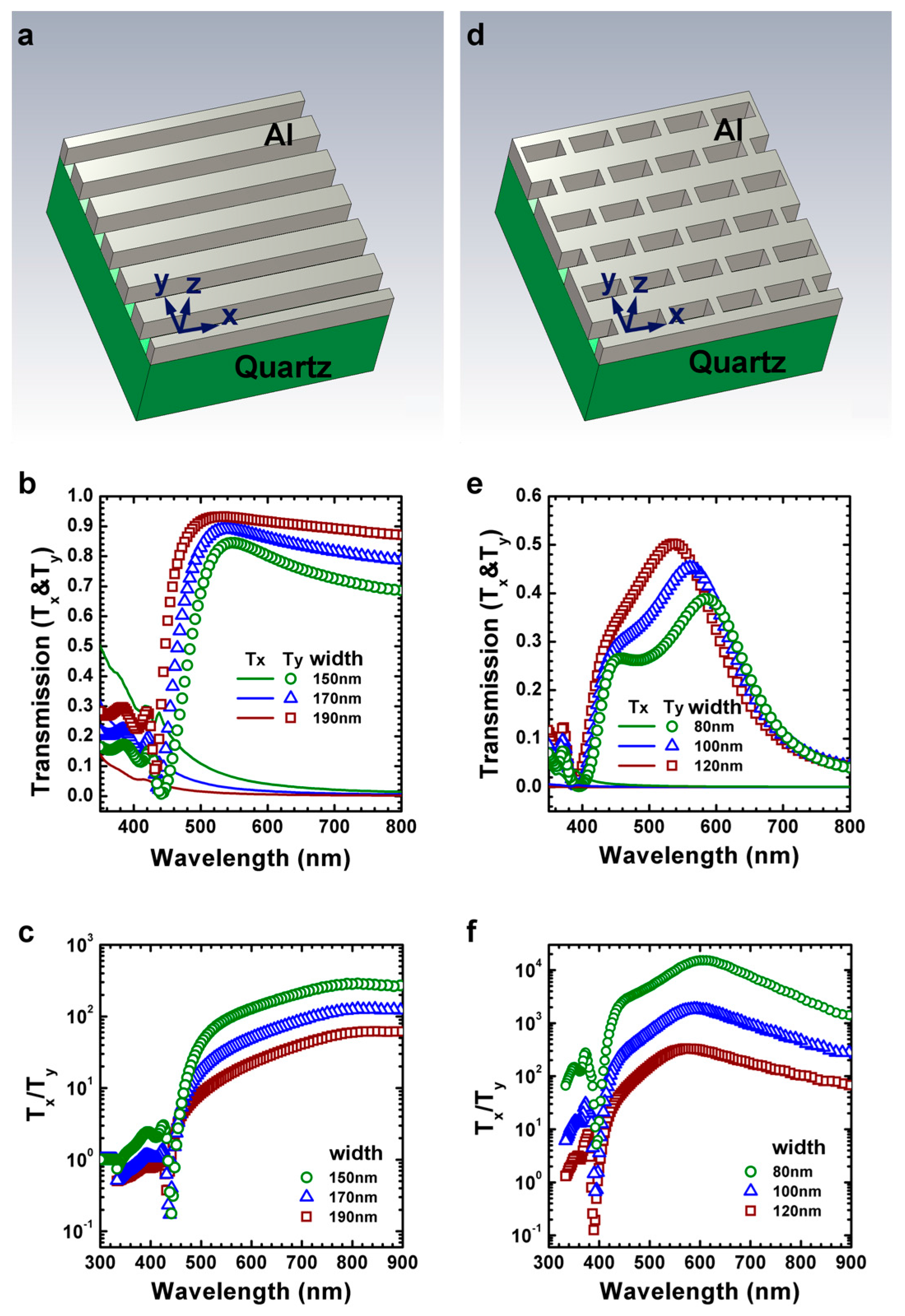 The simulation results are shown in Figure 1b,c. We can see that when the incident polarization is perpendicular to the slits, that is, along the y direction, optical transmission (Ty) can exceed 70% for wavelengths longer than 450 nm. When the incident polarization is parallel to the slits, that is, along the x direction, the optical transmission (Tx) is largely suppressed for wavelength larger than 450 nm. It can thus be expected that the PMM illuminated with non-polarized light will transmit linearly polarized light for wavelengths longer than 450 nm. The simulation results also show that when the slit width is increased, the optical transmission increases, the transmission band edge shifts to short wavelengths, and the polarization contrast decreases. Overall, the polarization contrast (Ty/Tx) can be higher than 10 for wavelengths longer than 450 nm, which is sufficient to induce a photoalignment effect.