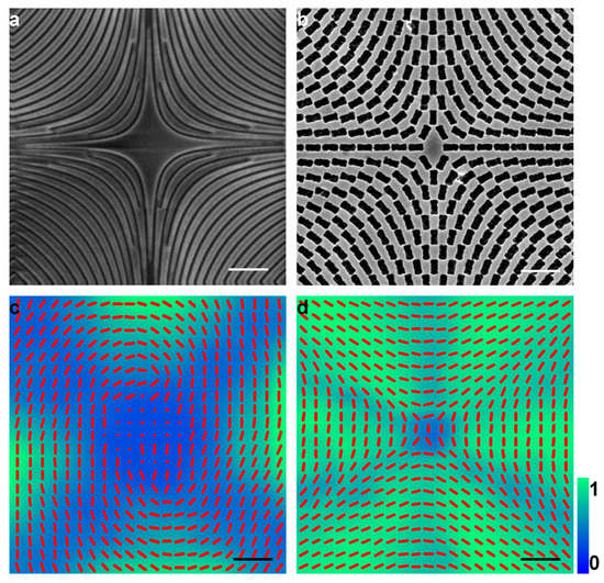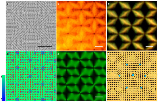 - Murray, B.S.; Pelcovits, R.A.; Rosenblatt, C. Creating arbitrary arrays of two-dimensional topological defects. Phys. Rev. E 2014, 90, 52501. [Google Scholar] [CrossRef] [PubMed]