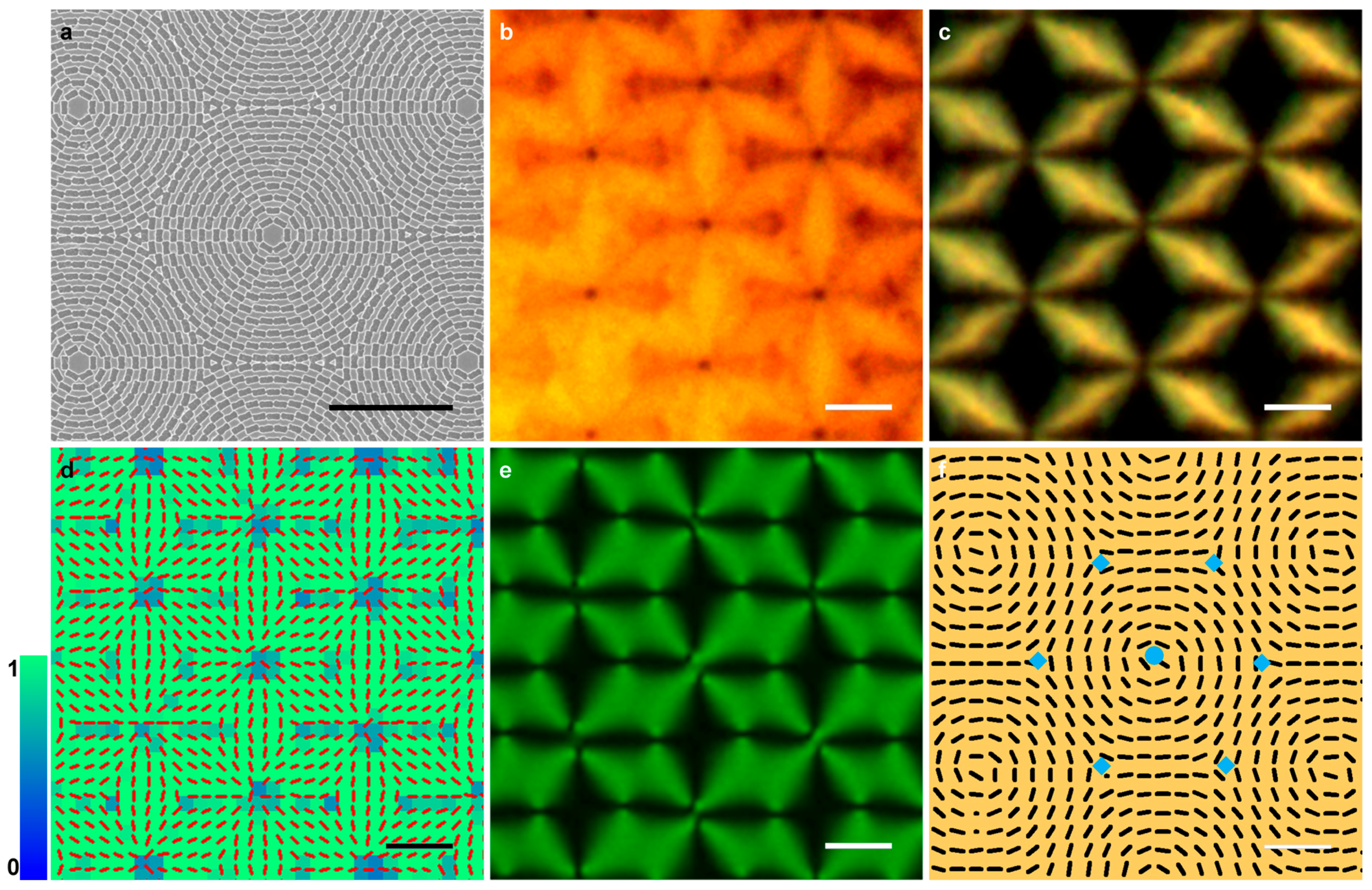 Exemplary PMM with curvilinear nanoslits. (a) SEM picture of a PMM; (b) Bright-field optical microscopy image of the PMM; (c) Cross-polarized optical microscopy image of the PMM; (d) Measured polarization direction for light transmitted through the PMM, the scale bar on the left hand side indicates the optical transmission; (e) Cross-polarized microscopy texture of a nematic LC in a cell patterned with the PMM; (f) Director pattern of the nematic LC cell shown in (e), the blue circle and diamonds correspond to the center of and −1/2 topological defects, respectively. The scale bars are 5 μm in (a–d) and 25 μm in (e,f).