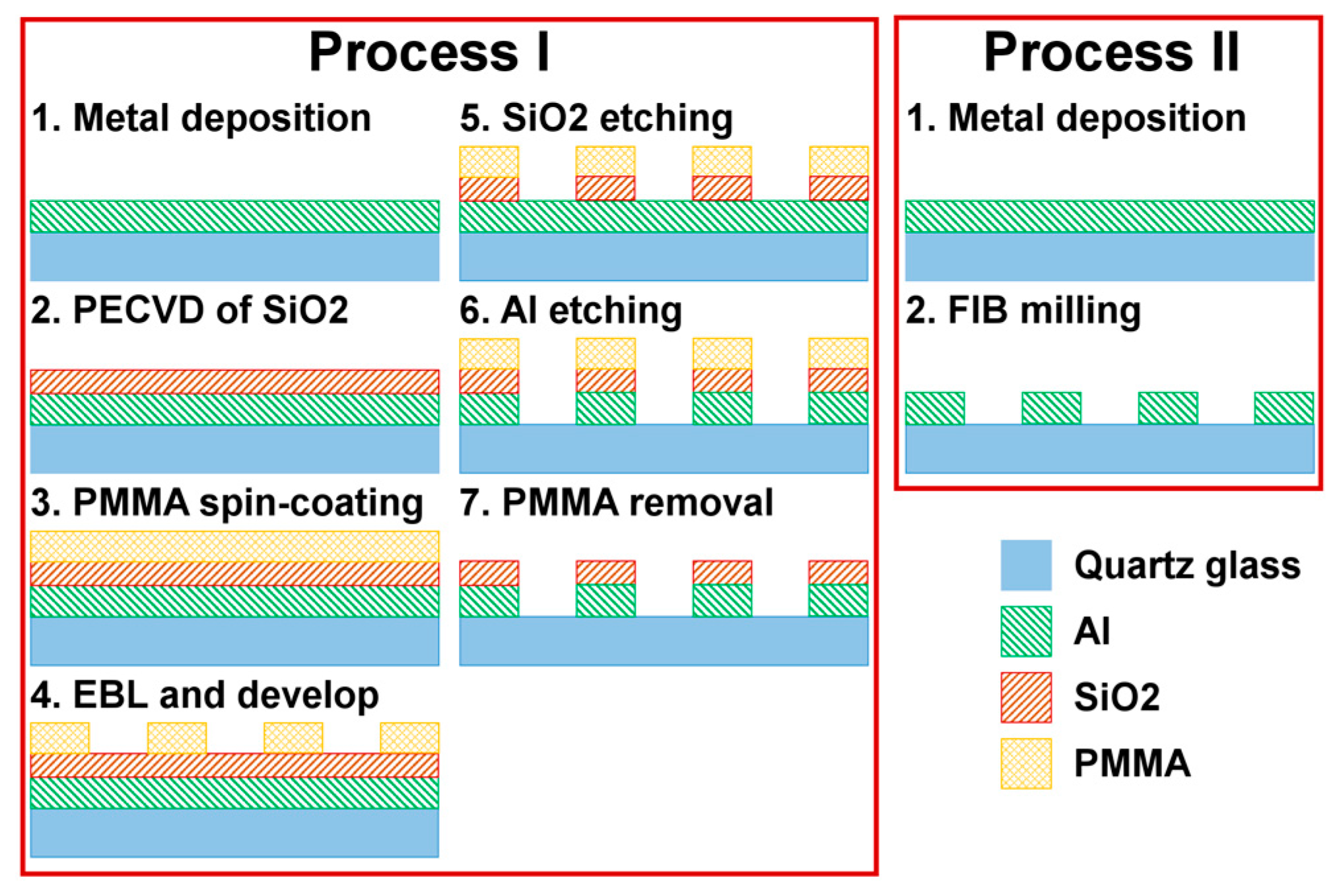 To fabricate the PMMs, we explored two different fabrication processes, as shown schematically in Figure 5. In Process I (Figure 5), fused-quartz substrates are firstly cleaned with the RCA process, 15 min immersed in a 75 °C solution of hydrogen peroxide, ammonium hydroxide and deionized water with 1:1:5 volume ratios. The cleaned substrates are deposited with a 5 nm film of Ti as an adhesion layer, then a 150 nm film of Al using an e-beam evaporation system. On top of the Al film, a 20 nm-thick SiO2 is deposited by plasma-enhanced chemical vapor deposition (PECVD). The substrates are then spin-coated with 100 nm-thick poly-methyl methacrylate (PMMA), and patterned with electron beam lithography (EBL). The patterns in PMMA are then transferred to the SiO2 layer by using reactive ion etching (RIE) with the recipe 10SCCM C4F8, 174SCCM He, 4 mTorr pressure. The patterns in the SiO2 layer are then etched through the Al films by using the RIE, with the recipe 30SCCM BCl3, 15SCCM Cl2, 4SCCM CH4, and 3 mTorr pressure. At the end, the substrates are cleaned with acetone and water to remove the remaining PMMA.