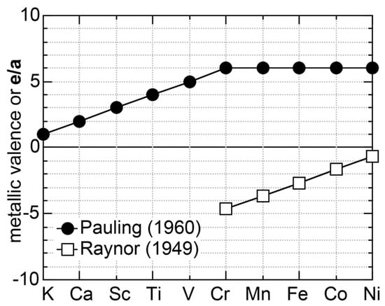Metallic valence or e/a proposed by Pauling [10] and Raynor [8] for elements in the Period 4 including 3d-transition metals [11].