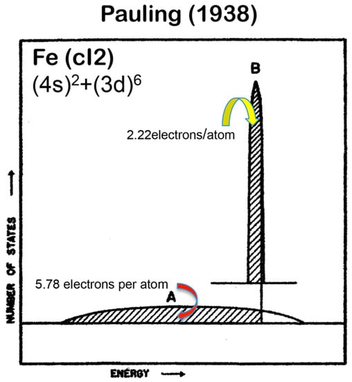 Pauling was the first to try to extend the concept of valence in inorganic compounds to the 3d-TM elements, where metallic bonding dominates. Pauling described the valence band of elements in the Period 4 including all 3d-TM elements like Fe as a superposition of a widely spread free electron-like band A and a weakly interacting narrow band B, as illustrated in Figure 2. It was assumed that a step by step increase in melting temperature from K, Ca, Sc, Ti to V with subsequent leveling off above about 1800 K up to Ni reflects an increase in the number of electrons filled in the band A and, thereby, contributes to reinforcement in bonding, while the emergence of magnetism from Cr to Ni is brought about by filling electrons into the band B. Pauling further conjectured that, among five d-atomic orbitals, 2.56 electrons are allowed to enter the band A, whereas remaining 2.44 electrons to enter the band B according to the Hund rule. He claimed his model to be able to explain not only an increase in melting temperature with its subsequent leveling off but also the behavior of the saturation magnetization with increasing the atomic number in the Period 4 elements. However, we must admit that the Pauling model is only qualitative and lacks rigorousness in its arguments. It is too crude to extract any quantitative information about the topics deeply related to the electronic structure of alloys and compounds involving 3d-TM elements.