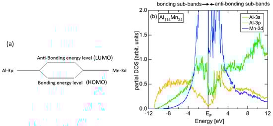 (a) Formation of bonding and anti-bonding levels due to orbital hybridization between neighboring Al-3p and Mn-3d atomic wave-functions; (b) Formation of a pseudogap between bonding and anti-bonding sub-bands due to orbital hybridizations between Al and Mn atoms in an Al-Mn approximant [11,18].
