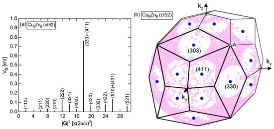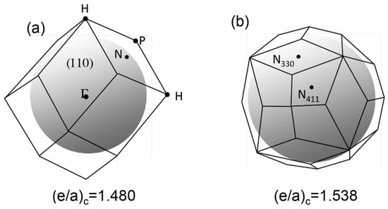 As mentioned in Section 1.1, Mott and Jones (1936) were the first to point out that the observed electron concentration e/a = for the gamma-brass Cu5Zn8 is close to e/a = 1.538 calculated from the condition that the free electron Fermi sphere touches the bcc-Brillouin zone bounded by 24-fold {411} and 12-fold {330} zone planes with . The two different Fermi surface-Brillouin zone interactions in the bcc structure are depicted in Figure 5 [11,14]: in (a) the free electron Fermi sphere touches the bcc first Brillouin zone at e/a = 1.48, while in (b) it touches the bcc higher Brillouin zone at e/a = 1.538. Note that the selection of higher Brillouin zone planes is indispensable for the gamma-brass. Only the use of the large Brillouin zones bounded by 24-fold {411} and 12-fold {330} zone planes with allows us to envision the interaction with a large Fermi sphere accommodating e/a = 1.538 in a straightforward manner. A distance from the origin Γ to centers of 36 zone planes in (b) is equal because of the condition . Thus, the free electron Fermi sphere touches all 36-face zone planes simultaneously, leading to the satisfaction of the interference condition within the free electron model.