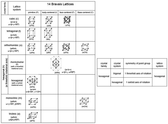 Seven lattices systems and fourteen Bravais lattices. The Pearson symbol is added in brackets. The right-hand panel shows that hexagonal in the crystal family can be also classified into trigonal and hexagonal with respect to the crystal system.