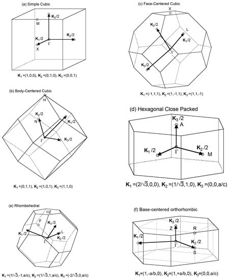 The first Brillouin zone of (a) simple cubic (sc) lattice; (b) body-centered cubic (bcc) lattice; (c) face-centered cubic (fcc) lattice; (d) hexagonal close packed (hcp) lattice; (e) rhombohedral lattice and (f) base-centered orthorhombic lattice [11].