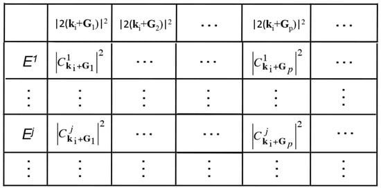 The squared sum of the real- and imaginary-parts of the Fourier coefficient in Equation (9) is calculated, when it is complex. We hereafter call it simply the Fourier coefficient. The Fourier coefficient is positioned at -th energy eigen-value in row and -th electronic state in column in the form of a matrix, as shown in Figure 8. Totally, matrices are produced for all available wave vector s.