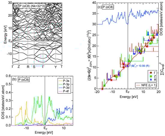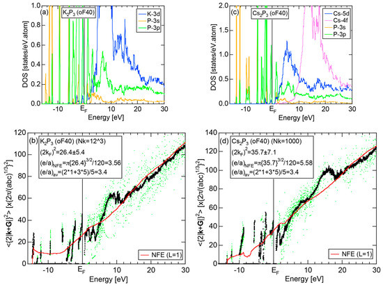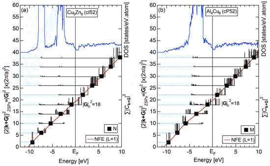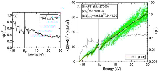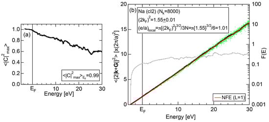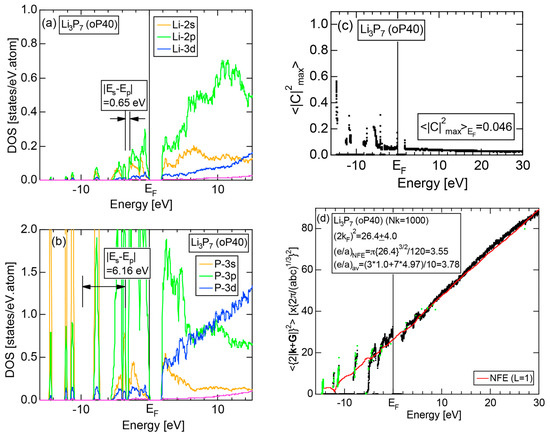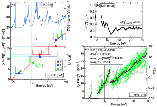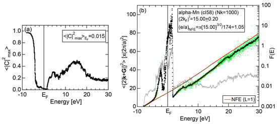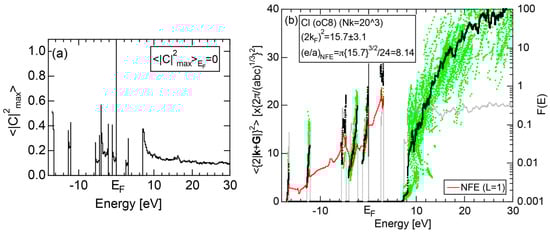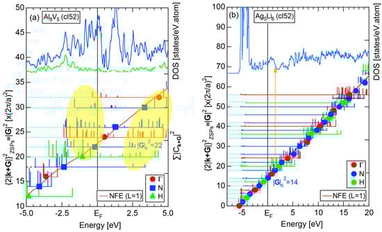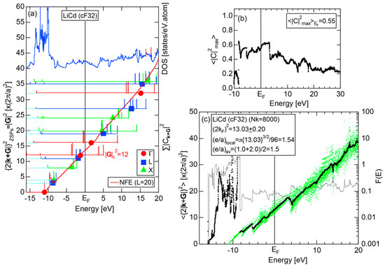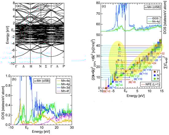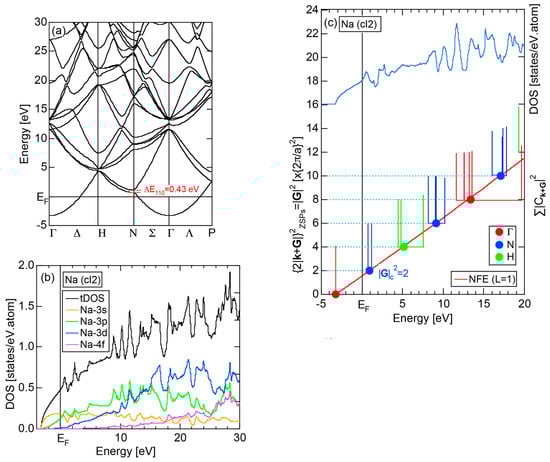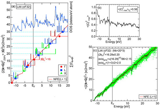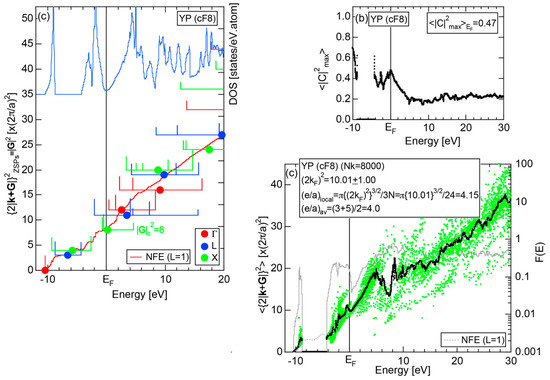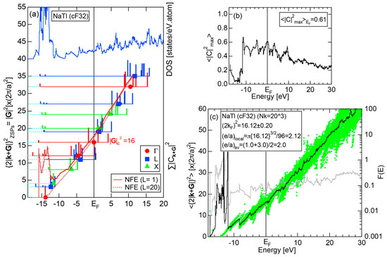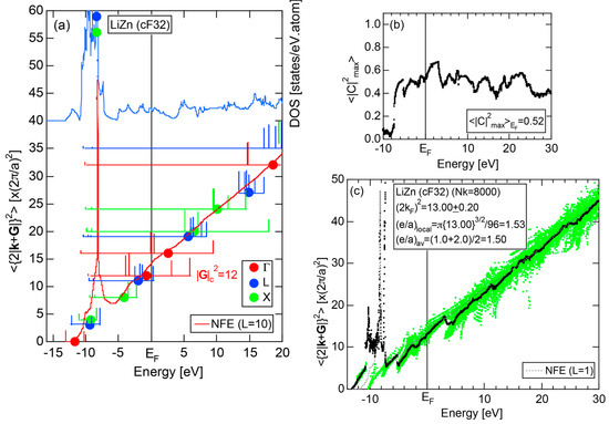 The Fourier coefficient for a given electronic state is plotted as a function of the corresponding energy eigen-values. The magnitude of each Fourier coefficient is expressed with a bar, the length of which is drawn in proportion to its magnitude on an arbitrary scale, as indicated on the right-hand side ordinate. A line connecting the feet of bars indicates the extent, over which the Fourier coefficients are distributed for the given state . The total-DOS is reproduced from Figure 9b and shown on the top of Figure 9c. It is clearly seen from Figure 9c that the spectrum of Fourier coefficients for a given is distributed over a finite energy range even under the condition L = 1. The center of gravity energy for Na (cI2) is plotted in Figure 9c with colored solid circles (Γ: red, N: blue, H: green). This can be regarded as the Nearly Free Electron (NFE) approximation, since the square of the wave-vector has one-to-one correspondence with its center of gravity energy and the data set falls on an almost straight line (red line) in accordance with the free electron model in the case of Na (cI2).