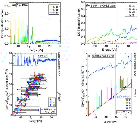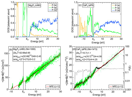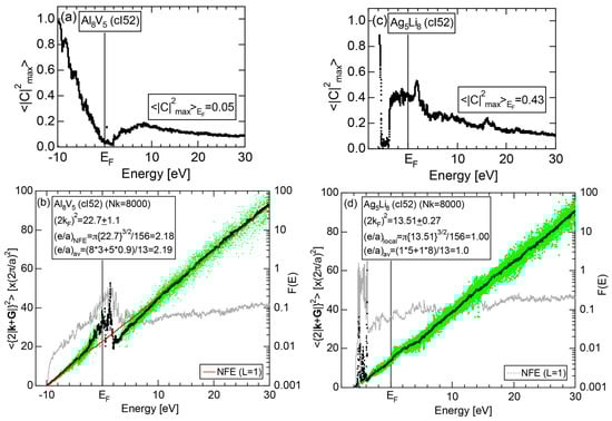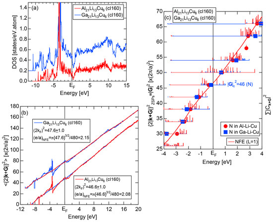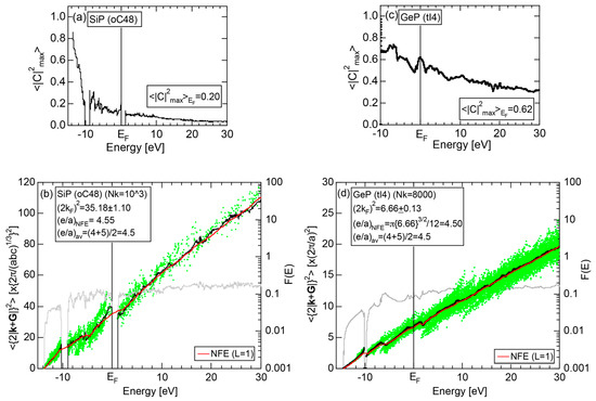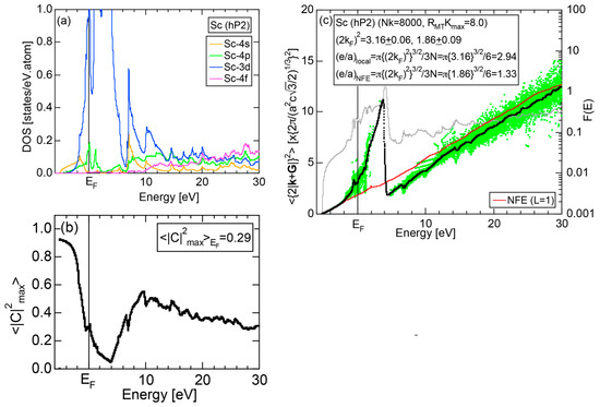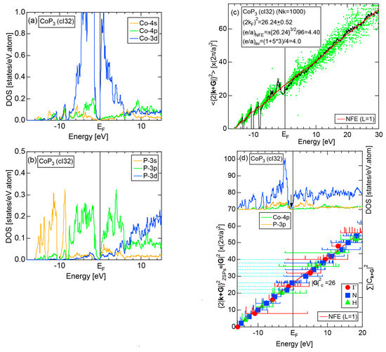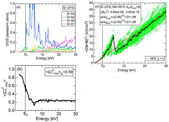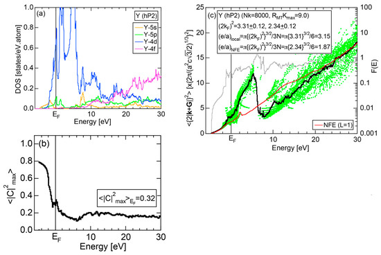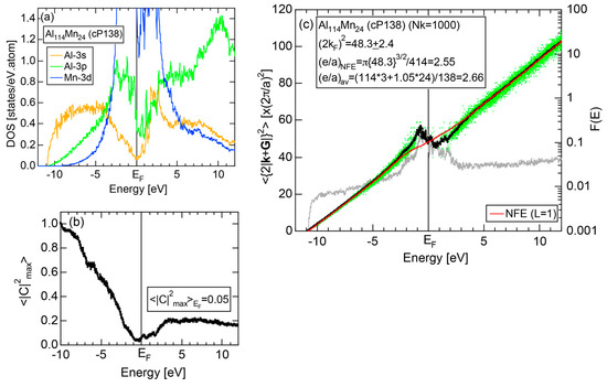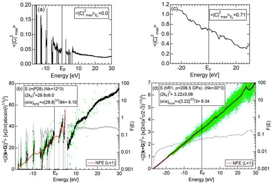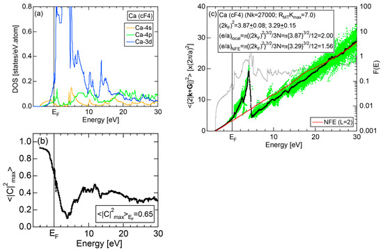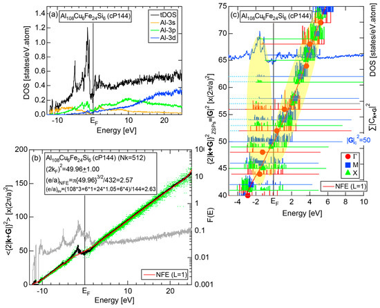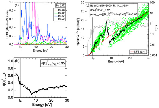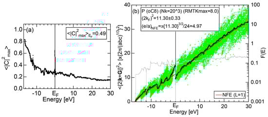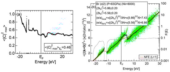 The Fourier coefficient for a given electronic state is plotted as a function of the corresponding energy eigen-values. The magnitude of each Fourier coefficient is expressed with a bar, the length of which is drawn in proportion to its magnitude on an arbitrary scale, as indicated on the right-hand side ordinate. A line connecting the feet of bars indicates the extent, over which the Fourier coefficients are distributed for the given state . The total-DOS is reproduced from Figure 9b and shown on the top of Figure 9c. It is clearly seen from Figure 9c that the spectrum of Fourier coefficients for a given is distributed over a finite energy range even under the condition L = 1. The center of gravity energy for Na (cI2) is plotted in Figure 9c with colored solid circles (Γ: red, N: blue, H: green). This can be regarded as the Nearly Free Electron (NFE) approximation, since the square of the wave-vector has one-to-one correspondence with its center of gravity energy and the data set falls on an almost straight line (red line) in accordance with the free electron model in the case of Na (cI2).