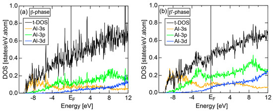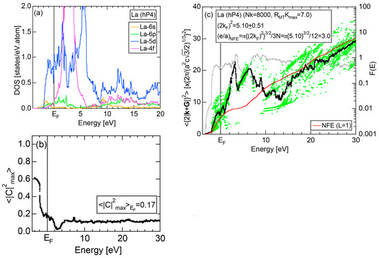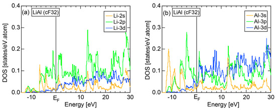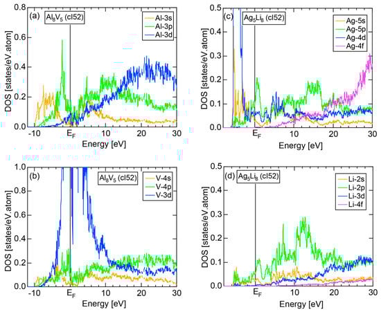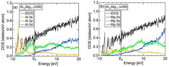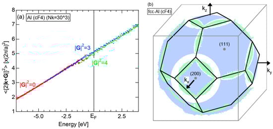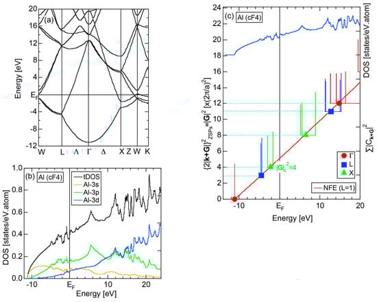 The dispersion relations and tDOS plus Al-3s, -3p and -3d pDOSs for Al (cF4) are shown in Figure 10a,b, respectively. There are a few van-Hove singularities immediately below the Fermi level. Its FLAPW-Fourier spectra are displayed in Figure 10c. The van-Hove singularities mentioned above can be ascribed to the Fermi surface-Brillouin zone interactions involving {111} and {200} zone planes with = 3 and 4, respectively.