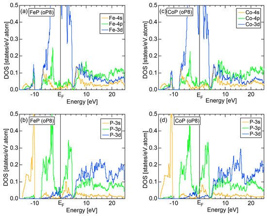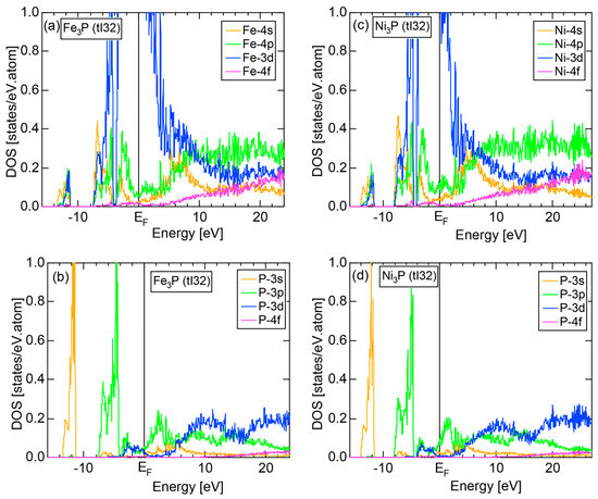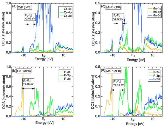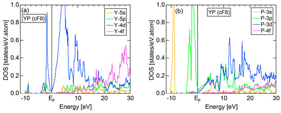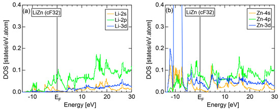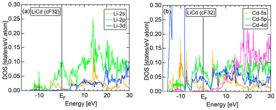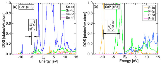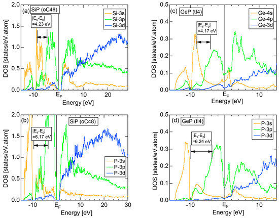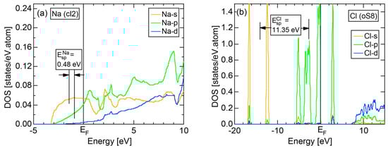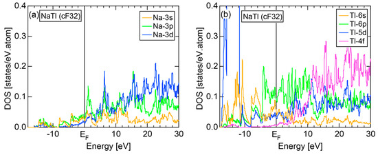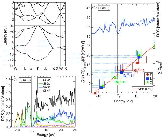 Both E-k relations and the tDOS plus pDOSs for Si (cF8) are depicted in Figure 11a,b, respectively. We can see the opening of an energy gap of the magnitude of 1 eV at the Fermi level, taking this as an evidence for Si (cF8) to be typical of a semi-conductor. In contrast to Na (cI2), the Si-3s pDOS is located at energies lower than that of Si-3p pDOS. Thus, a clear difference obviously arises, when the center of gravity energy is calculated for electrons in Si-3s and Si-3p pDOSs below the Fermi level. As will be discussed later, this is due to an increase in electronegativity in Si relative to more electropositive Na.