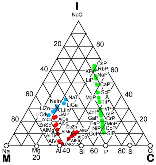 - Ishimasa, T. Hume-Rothery rule as a formation condition of new icosahedral quasicrystals. In The Science of Complex Alloy Phases; Massalski, T.B., Turchi, P.E.A., Eds.; The Minerals, Metals & Materials Society: Pittsburgh, PA, USA, 2005; pp. 231–249. [Google Scholar]