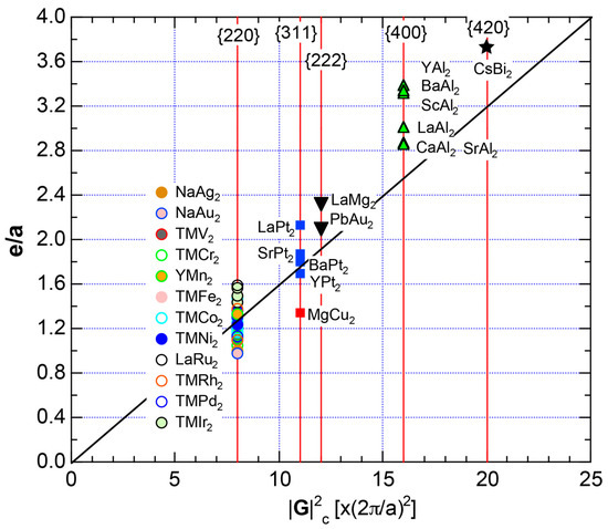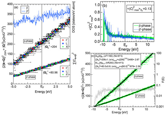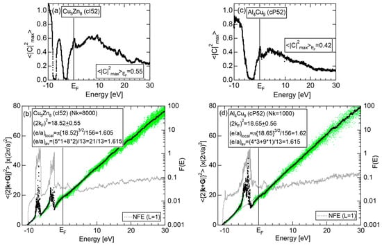 First, the energy dependence of the square of the Fourier coefficient (hereafter simply referred to as the Fourier coefficient) is calculated at symmetry points of the Brillouin zone. This has been named the FLAPW-Fourier spectra. The Fourier coefficients for -specified electronic states successively appear on symmetry points and are distributed over a finite energy range in a realistic system. Now each energy spectrum extending over a finite energy range is replaced by its center of gravity energy. This is a key step to circumvent anomalies due to the d-band or an energy gap and has enabled us to discuss the Hume-Rothery-type stabilization mechanism, regardless of the degree of metallic, covalent and ionic bondings involved. Then, we focus on how the center of gravity energy increases with increasing the electronic state at symmetry points (see Section 2.4.1) and pick up the one falling closest to the Fermi level. This refers to the electronic states at the Fermi level and, at the same time, represents the reciprocal lattice vector or the set of lattice planes or Brillouin zone planes interacting with electrons at the Fermi level. This means that we can simultaneously extract both quantities and appearing in Equation (1) from the FLAPW-Fourier spectra.