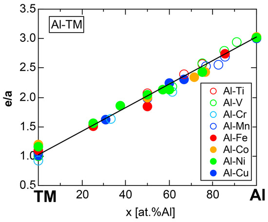 Figure 107 depicts (e/a)compound derived from the FLAPW-Fourier theory for Al-TM and P-TM (TM=Sc to Cu in Period 4 in the Periodic Table) compounds as a function of nominal e/a given by a composition average of e/a of constituent elements listed in Table 1. Open circles indicate FLAPW-Fourier-derived e/a values for pure elements and are located on the line (e/a)compound = (e/a)av. Here e/a values for non-TM elements are rounded off to integers: 2 for Mg and Ca, 3 for Al, Ga and Sc, 4 for Si and Ge and 5 for P in a perfect agreement with the respective nominal valences. Instead, the non-integer values listed in Table 1 are employed, as they are, for TM elements.