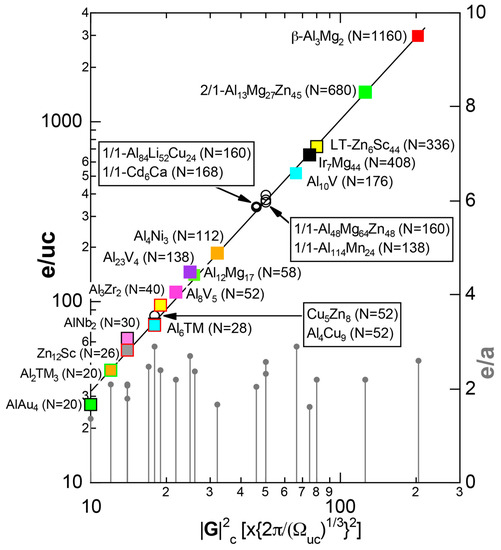 - Mizutani, U.; Inukai, M.; Sato, H.; Zijlstra, E.S. Hume-Rothery stabilization mechanism and e/a determination in MI-type Al-Mn, Al-Re, Al-Re-Si, Al-Cu-Fe-Si and Al-Cu-Ru-Si 1/1-1/1-1/1 approximants—A proposal for a new Hume-Rothery electron concentration rule. Philos. Mag. 2012, 92, 1691–1715. [Google Scholar] [CrossRef]