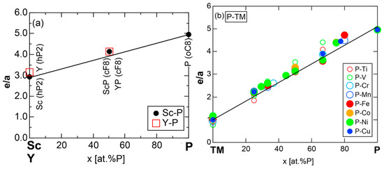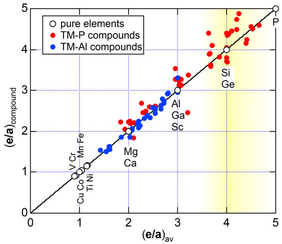 (e/a)compound versus (e/a)av for Al-TM () and P-TM () compounds studied in the present work, where TM covers from Sc to Cu in Period 4 in the Periodic Table. The data from Figure 54 and Figure 74 are combined. The data for pure elements marked with open circles are located on the line (e/a)compound = (e/a)av. Numerical data in Table 1 are rounded off to the nearest integer or valence for simple elements but are used as they are for TM elements. The yellow gradation area is centered at e/a = 4.0.
