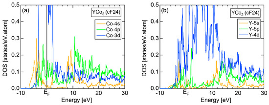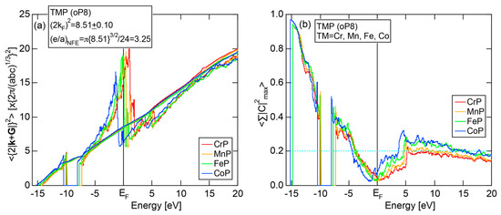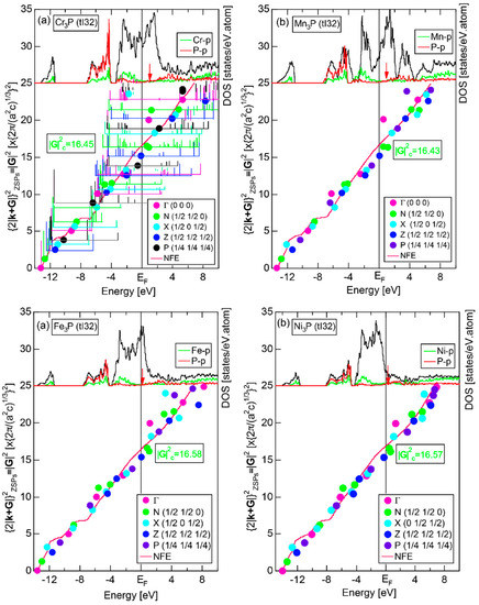 The replacement of the electronic state by a new reciprocal lattice vector means that the set of lattice planes appearing in the right-hand side of Equation (1) and the electronic states appearing in its left-hand side become identical at symmetry points. Therefore, it is important to note that the interference condition is perfectly fulfilled as both vector and scalar quantities, as long as is set at symmetry points of the Brillouin zone. The spectra thus constructed are called the FLAPW-Fourier spectra or briefly FF-spectra. We can, therefore, say that a pseudogap can be formed across the Fermi level, provided that Fourier coefficients are distributed in its neighborhood in the FF-spectra.